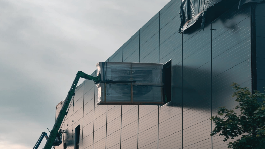 Kohteen ilmanvaihtokoneet nostettiin kurottajalla ulkoseinän läpi suoraan konehuoneeseen. Tässä nostetaan iv-koneen roottorin puolikasta.